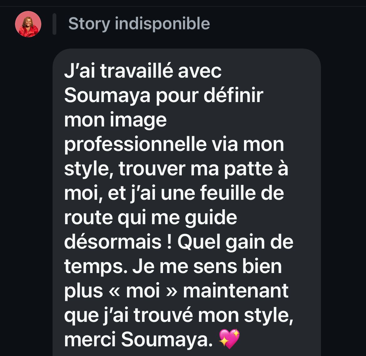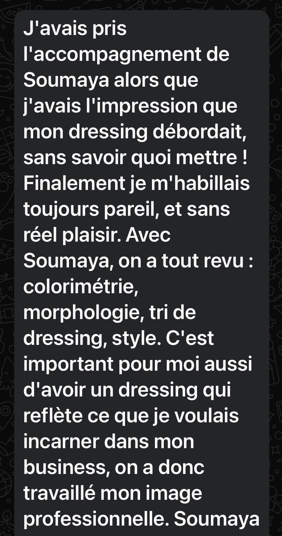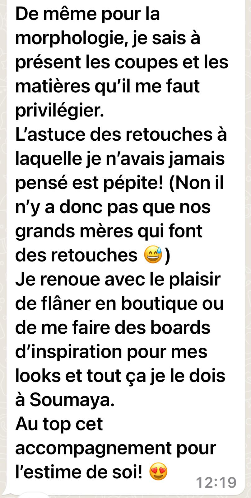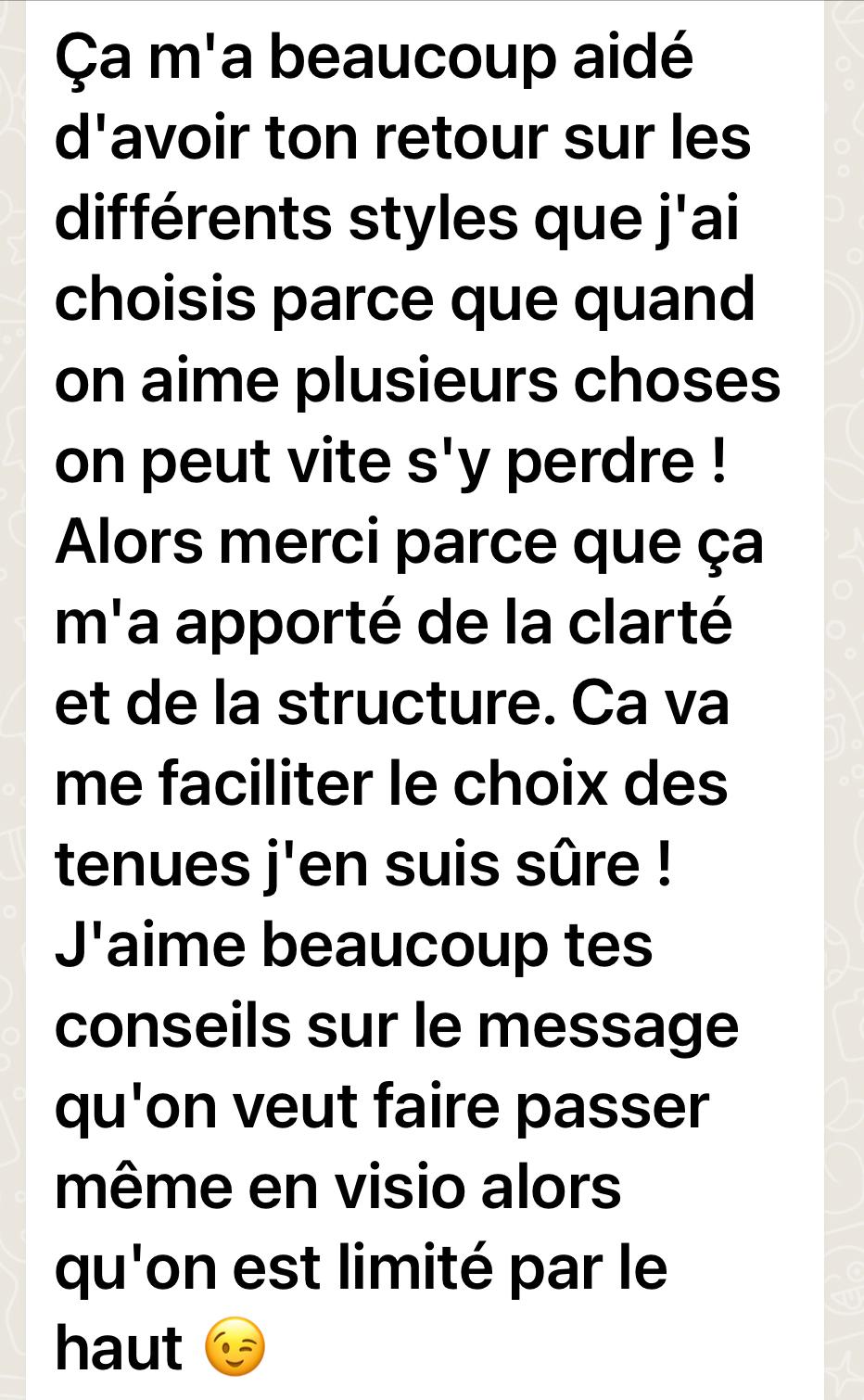 un accompagnement où tu as accès à une coach en image à tout moment, qui t’aide à faire des choix éclairés tout en te donnant les clés pour rester autonome.
