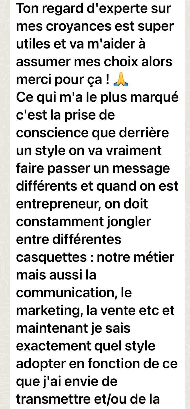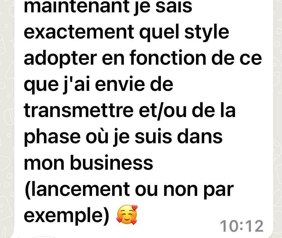 Être perçue comme authentique et professionnelle est un atout majeur pour attirer la confiance de tes clientes potentielles. Cela facilite une connexion fluide et te positionne immédiatement comme une experte dans ton domaine, sans avoir à justifier tes tarifs. Lorsque ton image est alignée avec ta personnalité, tu peux proposer des tarifs premium, et tes clientes seront prêtes à investir en toi. Tu auras une posture assumée, et cette confiance te permettra d’attirer naturellement tes clientes de rêve, celles avec qui tu adores travailler.