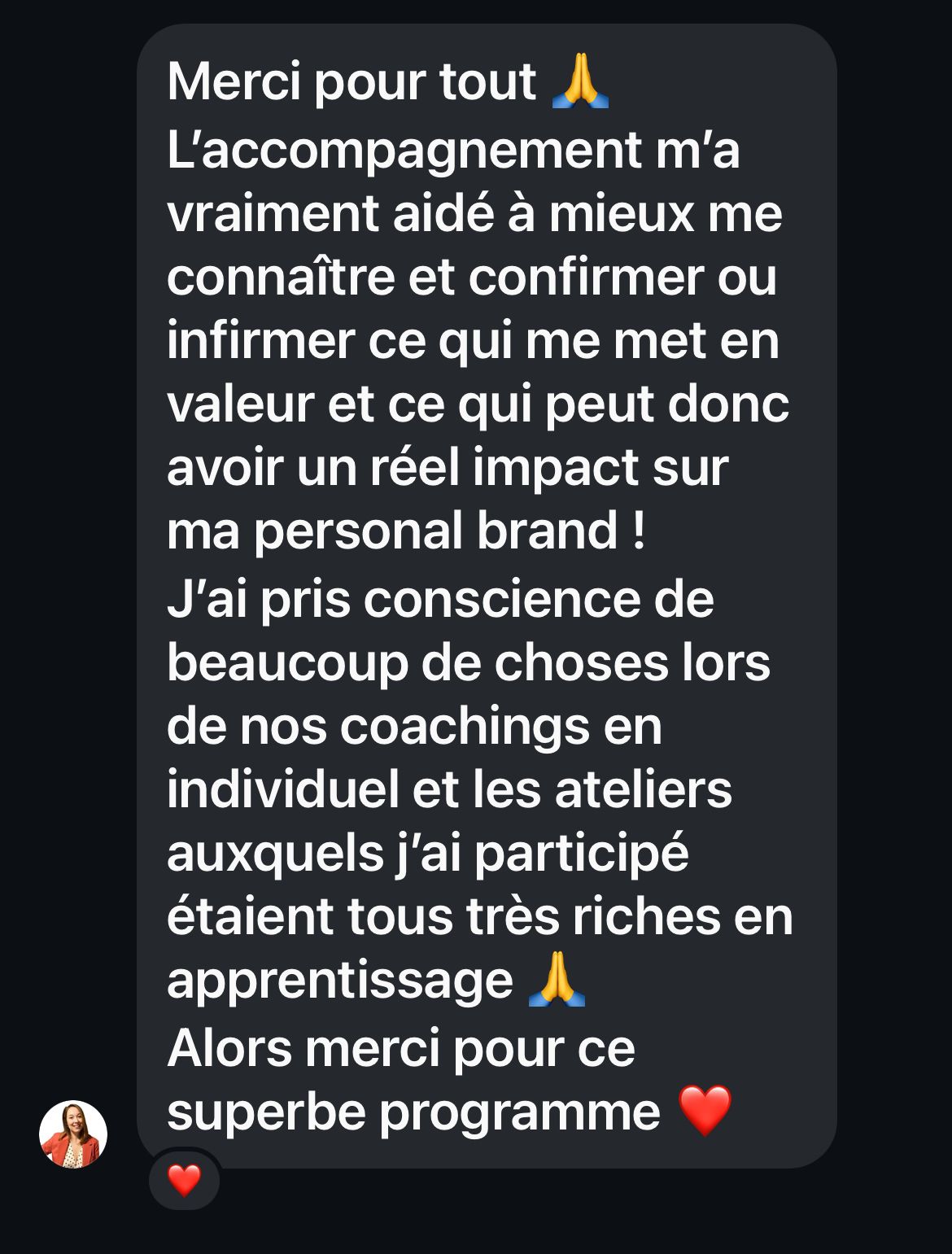 J’hésite encore ? Je propose une consultation découverte gratuite pour que je puisse poser toutes mes questions et déterminer ensemble si cet accompagnement est adapté à mes besoins. De plus, les témoignages d’autres entrepreneures ayant déjà suivi ce programme témoignent des résultats concrets qu’elles ont obtenus. Je pourrais être la prochaine à transformer mon image et développer mon business !